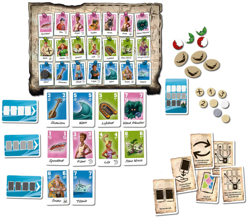 From the makers of the award-winning The Crew series: a cooperative The-Crew-style game with easier-to-learn rules and a captivating story to thrill the entire family. Stranded on a desert island in the middle of the ocean, a group of young people must find their way home through a series of 35 missions. Eat, sleep, make decisions — how will the adventure end? Three to five players play cards one after the other — and without talking to each other — until each mission is completed. A gameboard, island marker, various tokens, and special cards help players keep track of the game and offer opportunities to influence the course of the missions.