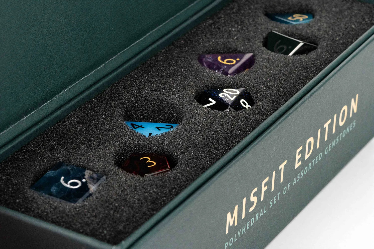The Mystery Gemstone sets are part of our misfit line and can include dice from any number of different sets and sources. Some of these dice may have minor issues like off-center or scratched numbers, while others are simply assorted gemstone dice with varying rarity.